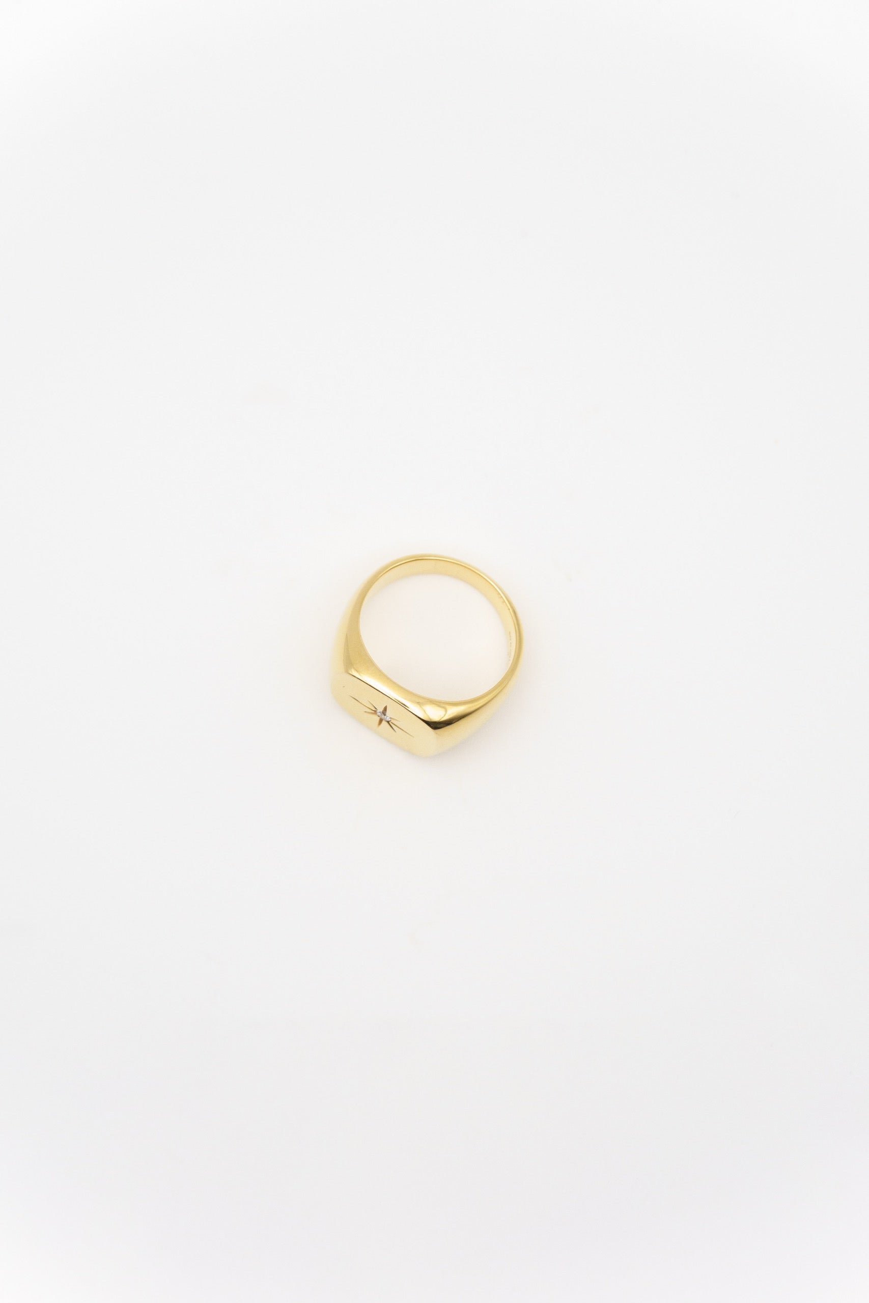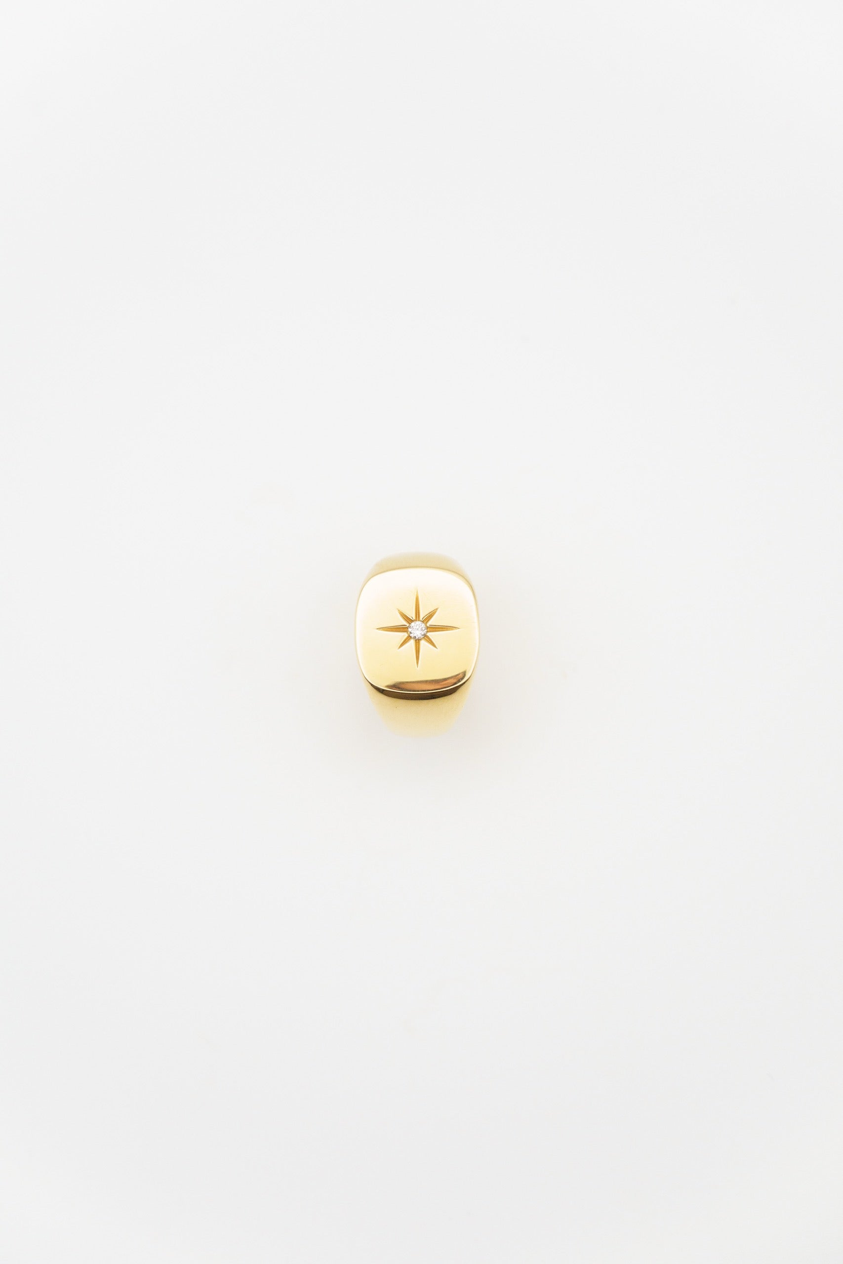 Este anillo de oro de 18 quilates tiene un diseño elegante y simbólico. Su forma robusta y pulida destaca por el grabado de una estrella de ocho puntas al centro, que enmarca un brillante diamante engastado. El contraste entre el oro liso y el destello de la piedra crea una pieza de estilo minimalista pero con gran presencia y significado, evocando guía, luz y protección.