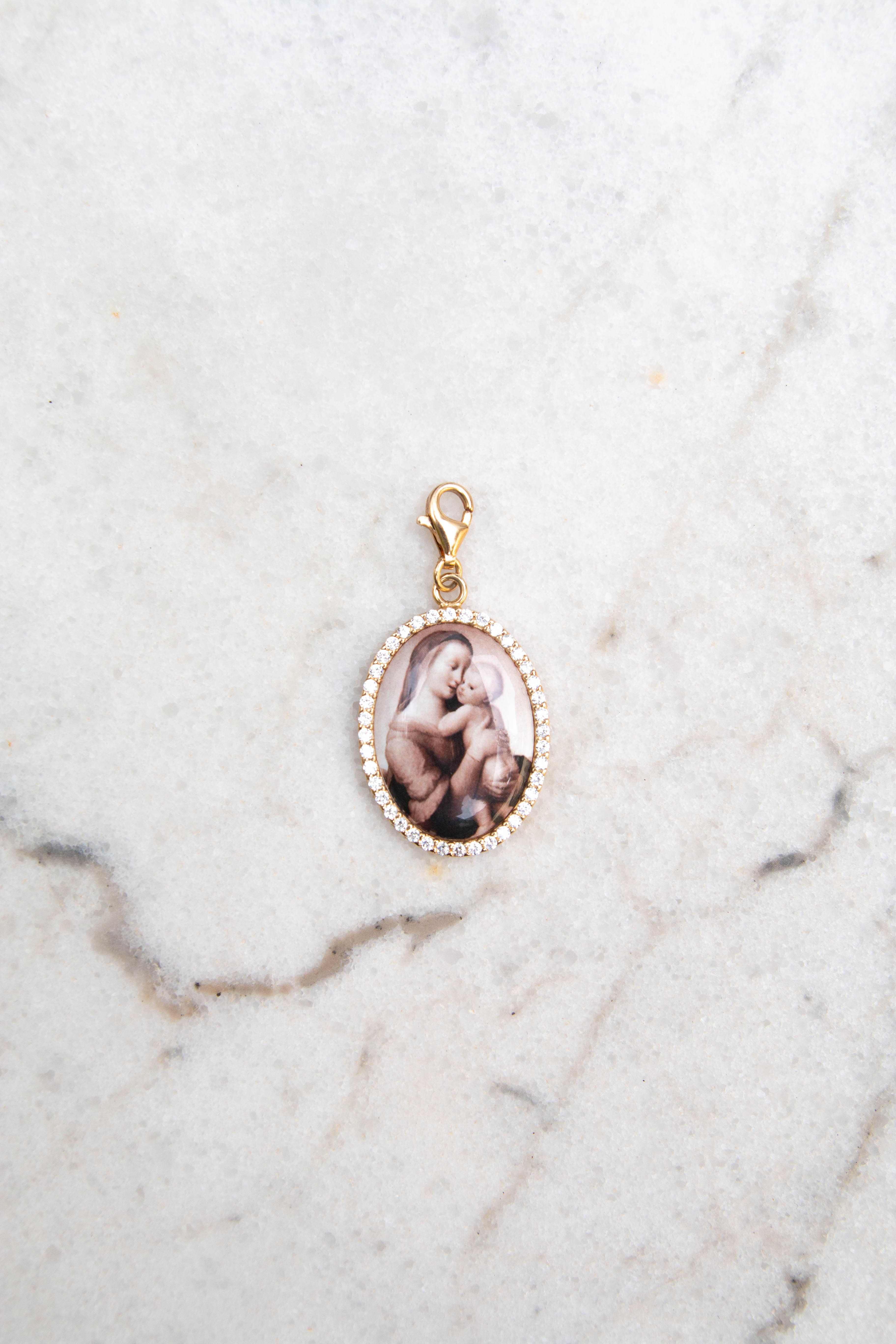 Bordeado de circonitas. Incluido un cierre mosquetón para colgarlo en cualquier prensa.