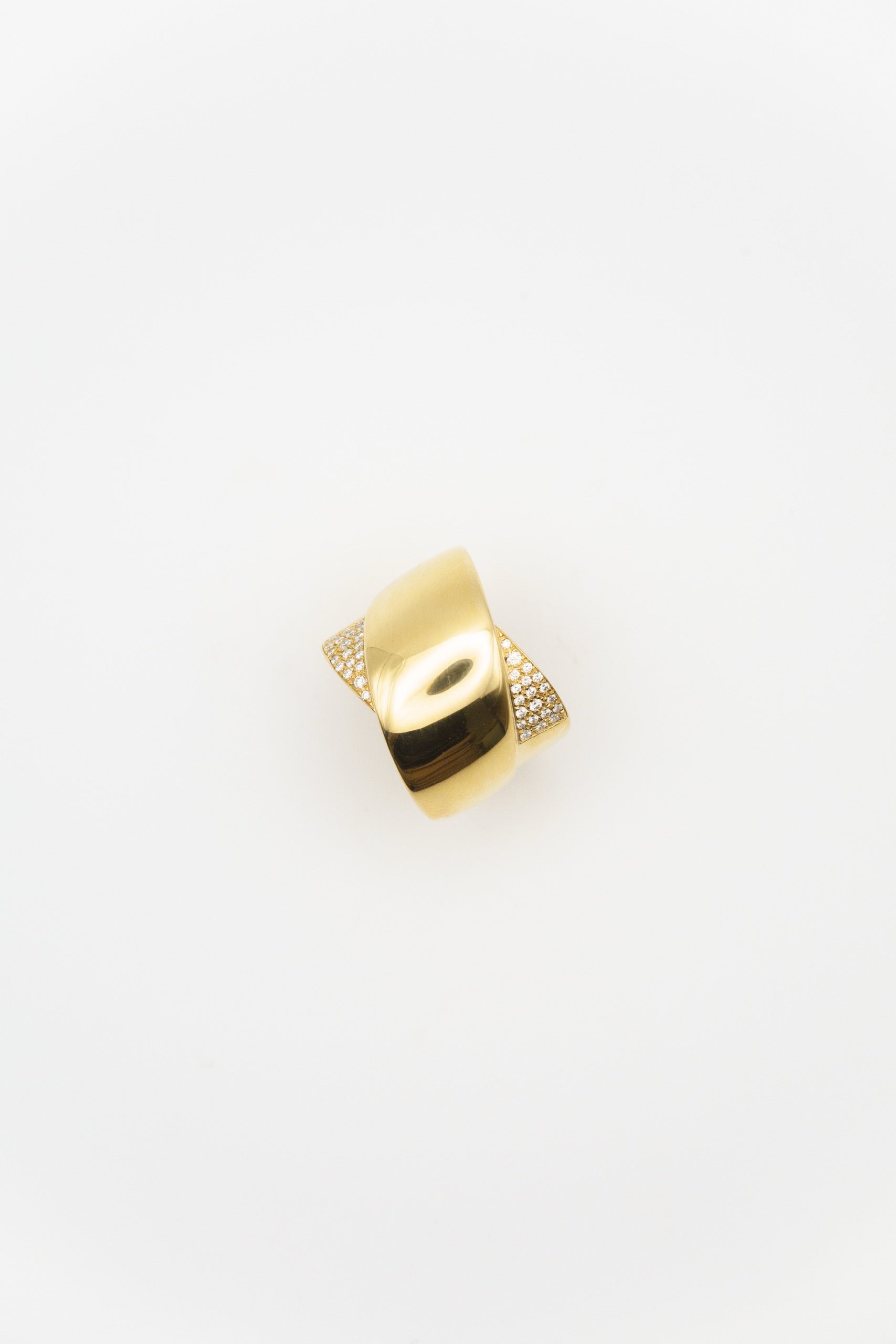 Este anillo de oro de 18 quilates presenta un diseño moderno y elegante, con una forma ancha y curva que envuelve el dedo con un efecto escultural. En ambos extremos, se destacan delicados diamantes engastados en pavé, que aportan un toque de brillo sutil pero sofisticado. La superficie pulida del oro refleja la luz con intensidad, realzando la belleza de los diamantes y el diseño envolvente.
