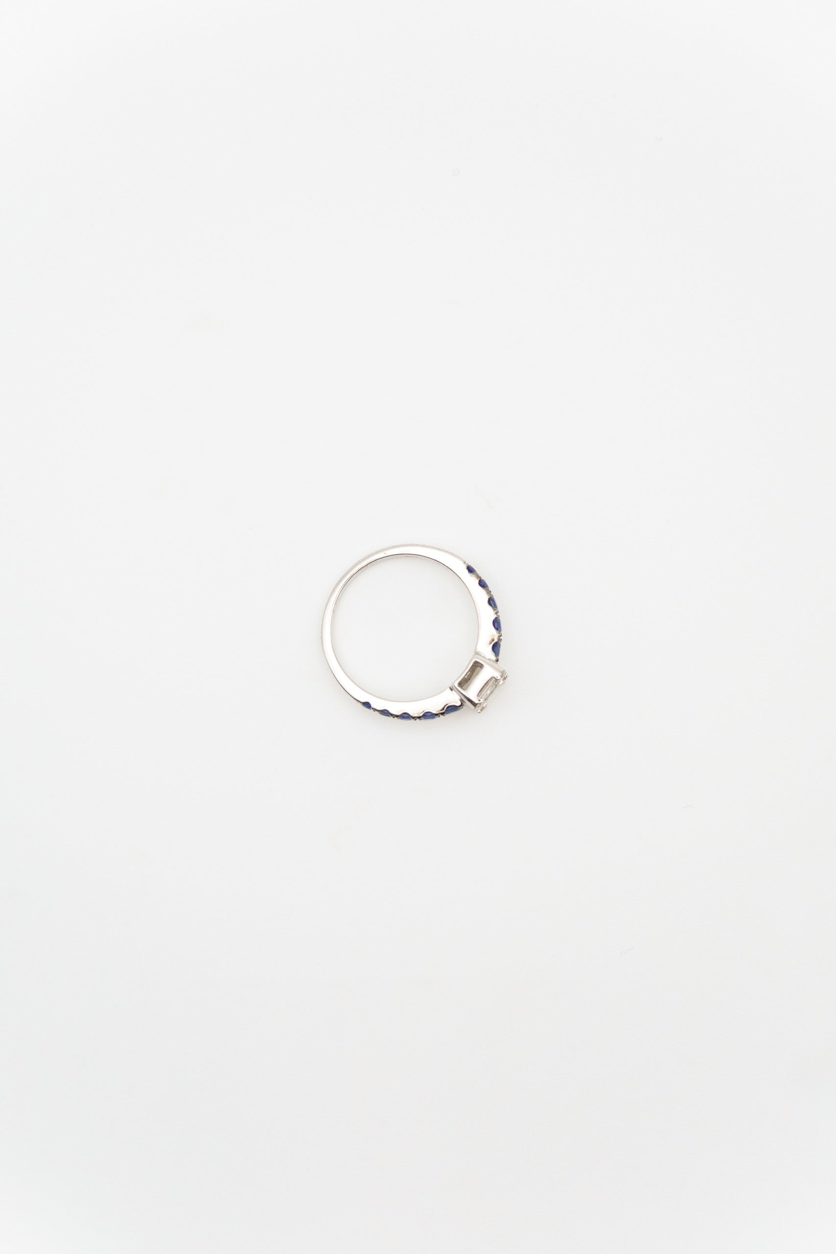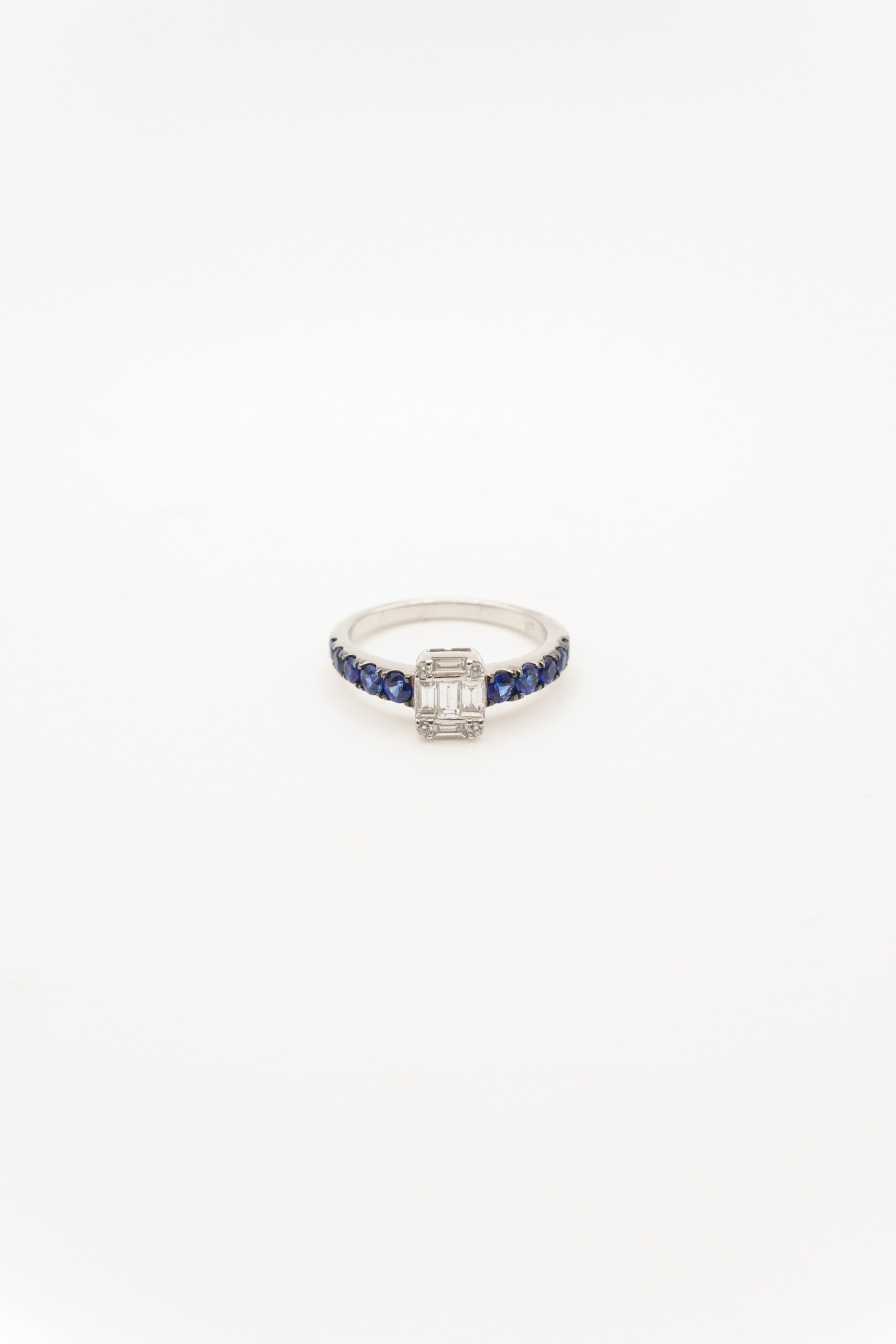 El aro, de oro blanco pulido, es delgado y sutil, pensado para resaltar las piedras sin competir con ellas. Esta joya, aunque sobria, tiene una fuerza visual impactante: es perfecta para alguien que valora el equilibrio entre lo clásico y lo moderno, entre la luz pura del diamante y la intensidad del zafiro.