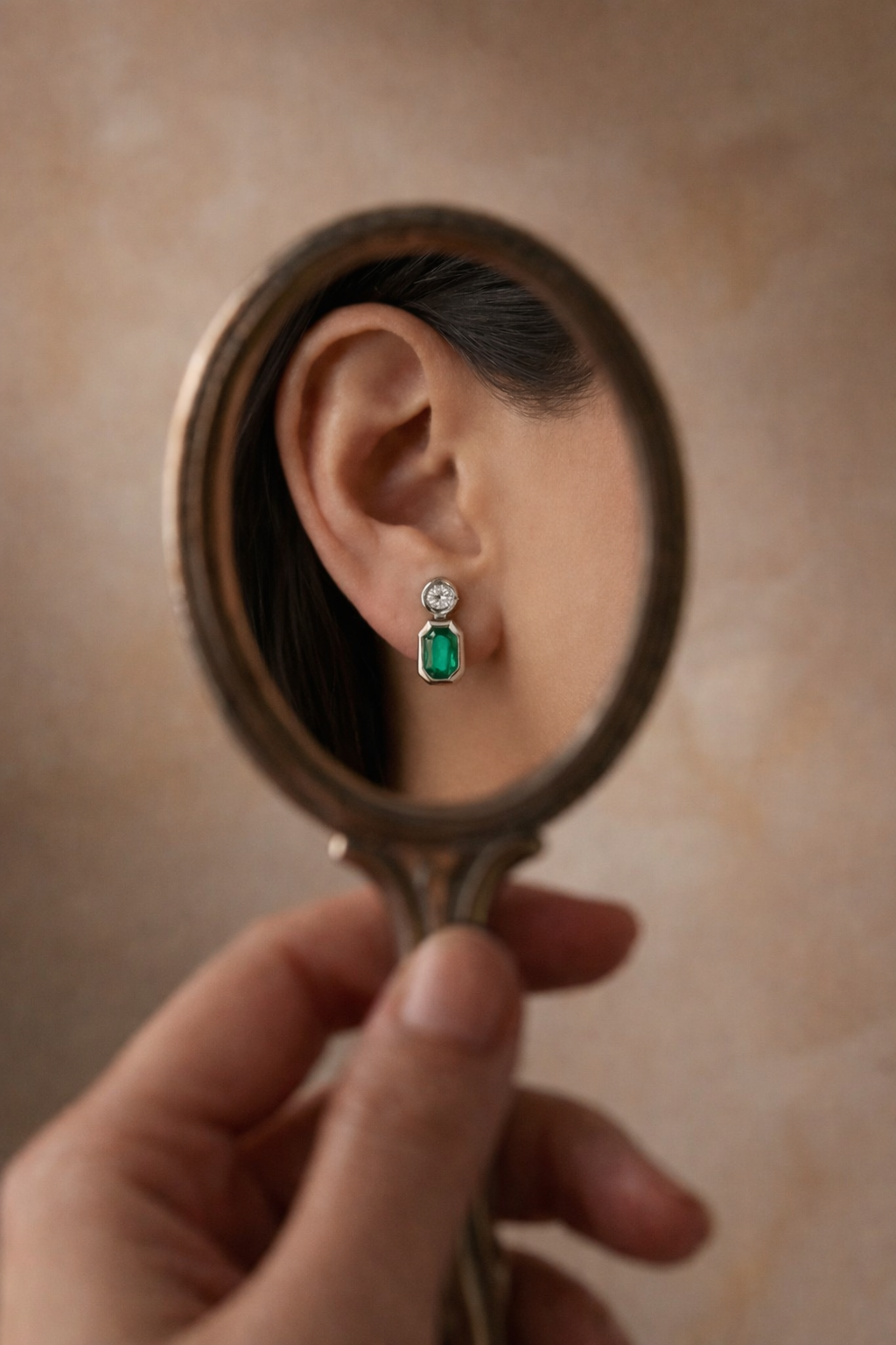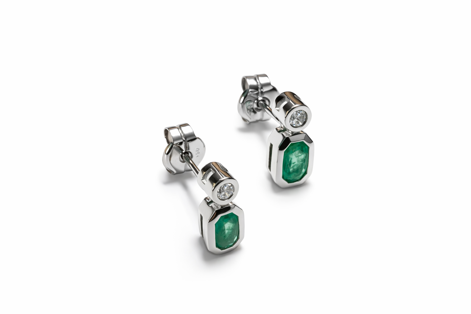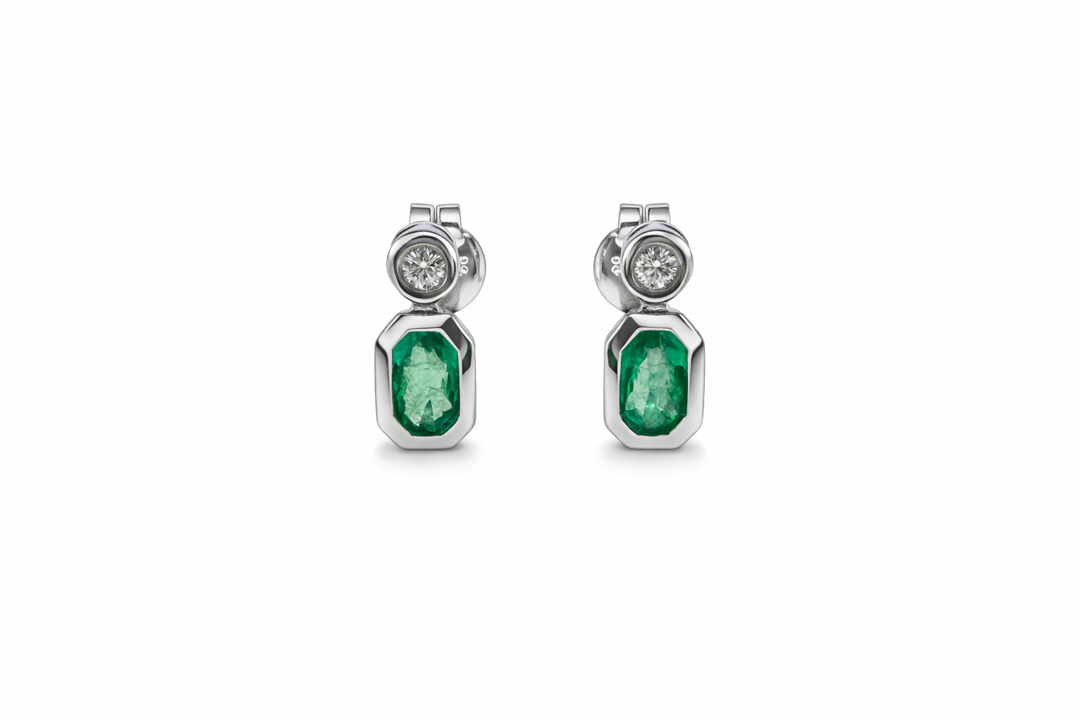 Su diseño equilibrado y atemporal combina la pureza del diamante con la intensidad de la esmeralda, creando una pieza versátil, ideal tanto para el día como para ocasiones especiales.