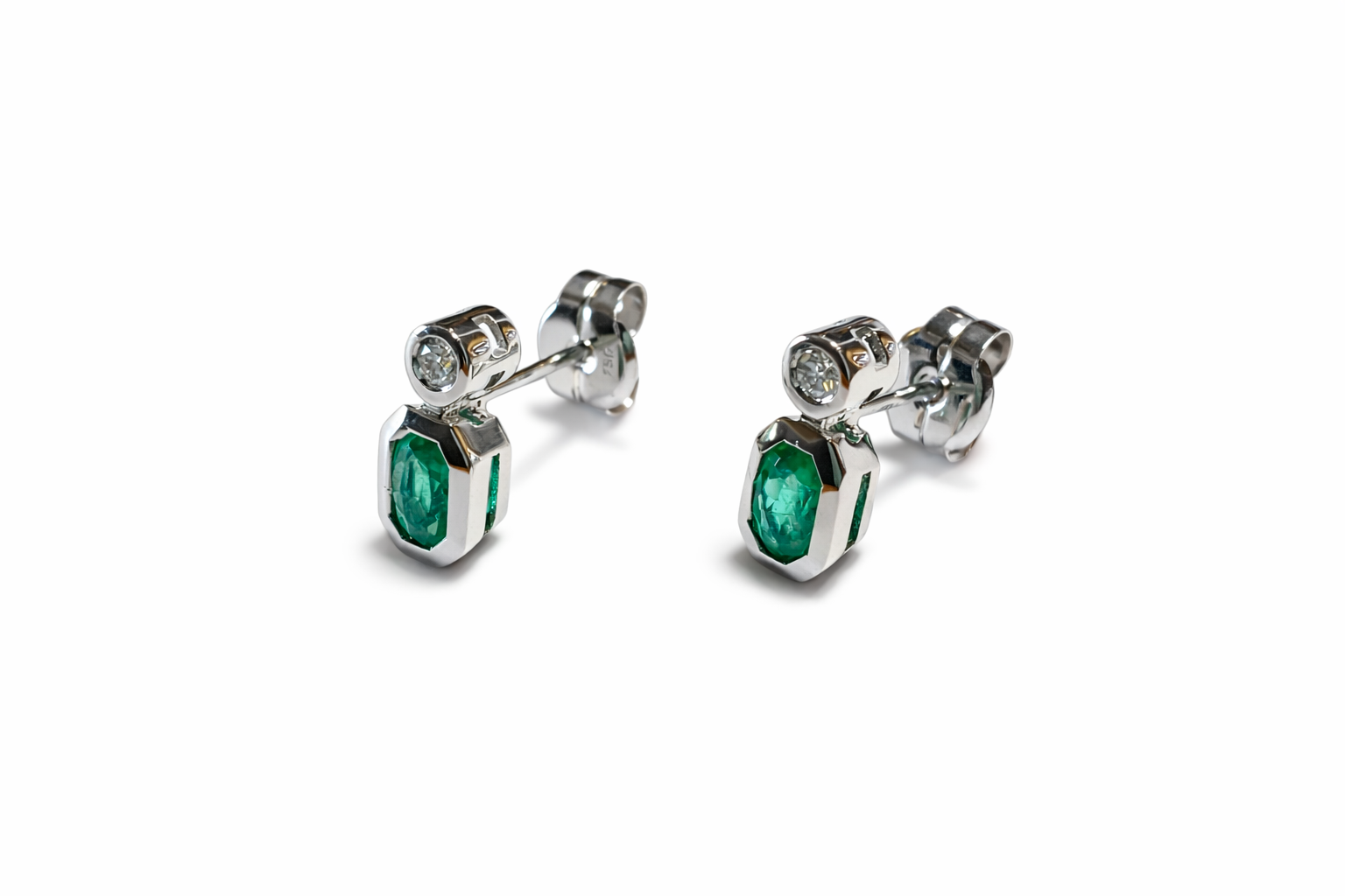 Elegante pendiente en oro blanco de 18kt, diseñado para aportar sofisticación y luminosidad. Presenta un delicado diamante redondo de 0,10ct en la parte superior, que aporta un brillo sutil y refinado. Bajo él, cuelga una esmeralda de 1ct de intenso color verde, tallada para resaltar su belleza natural y profundidad.