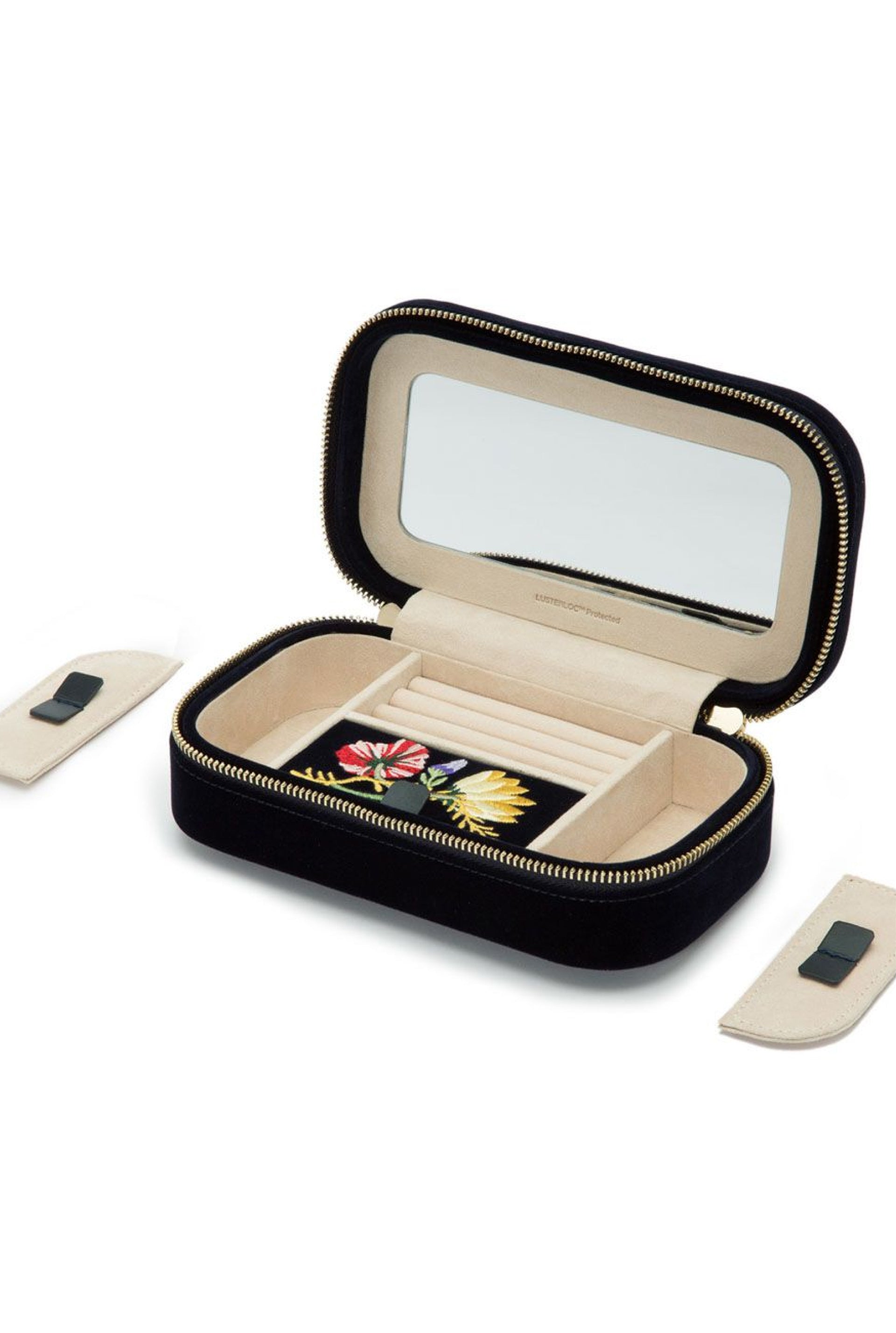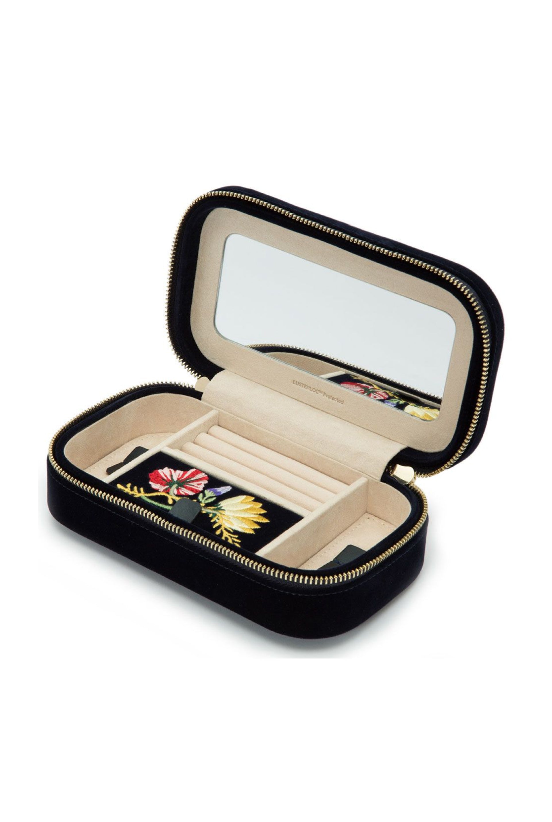 Fresca y divertida, Zoe es sofisticada pero alegre. Organiza tus joyas sobre la marcha con el femenino y funcional estuche de viaje con cremallera Zoe. Incluye exterior de terciopelo, LusterLoc™ y espejo.